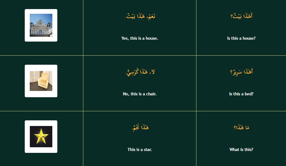 Part 1 of Lesson 1 teaches us how to utilize the pronoun هَـٰذَا which means ‘This’ (called the demonstrative pronoun in grammar). /Hādhā/ is pronounced هَاذَا but is written without the first /alif/. The second word is the noun (object) being referred to, e.g.: بَيْتٌ means house.